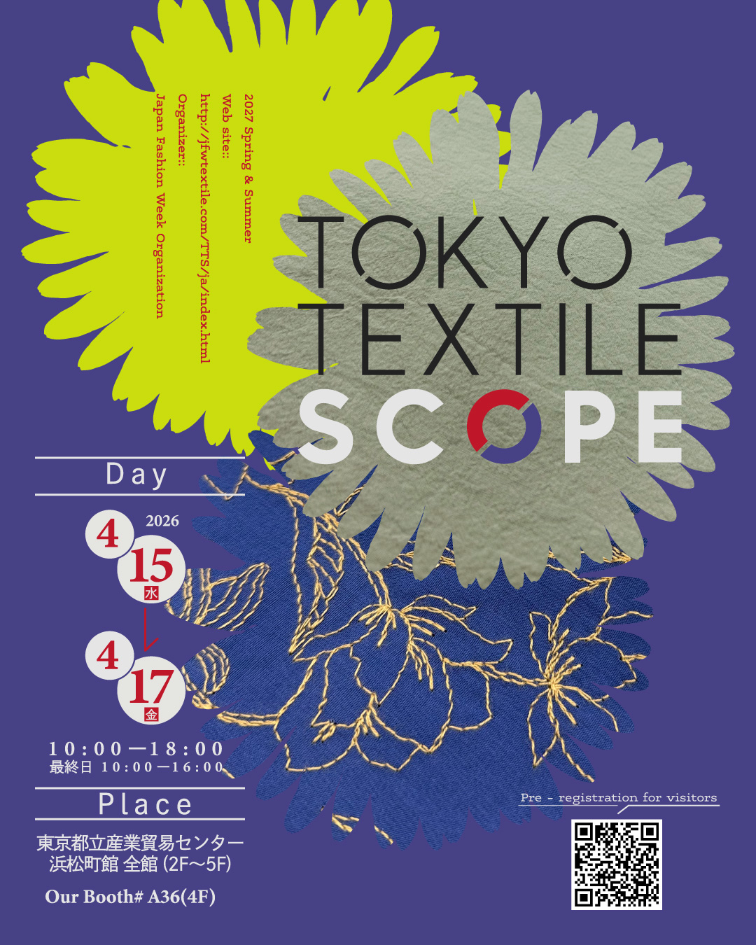 NEWS ALL FOR HOME HOBBY FOR FASHION FOR FASHION 2026.04.10 展示会出展のお知らせ TOKYO TEXTILE SCOPE(TTS) このたび、来週開催される TOKYO TEXTILE SCOPE(TTS)に出展いたします。 2027年春夏向けを中心に、新商品も含め皆様にご覧いただきたい魅力的なラインナップを多数ご用意しておりますので、 ご来場の際はぜひ弊社ブースへお立ち寄りください。 【開催概要】 ◆開催期間 4月15日(水) 10:00-18:00 4月16日(木) 10:00-18:00 4月17日(金) 10:00-16:00 ◆開催場所 東京都立産業貿易センター 浜松町館 全館2F~5F 東京都港区海岸1-7-1 東京ポートシティ竹芝 《弊社 Booth No. A-36 ※4F》 ◆主催 一般社団法人 日本ファッション・ウィーク推進機構 ◆Web SITE https://jfwtextile.com/TTS/ja/index.html ◆ご来場には、必ずWEB事前登録が必要です。 以下のWEB事前登録サイトから申請者情報を入力し、 事前に入場証の準備をお願いします。 来場事前登録はこちら>> スタッフ一同、皆様とお会いできることを心より楽しみにしております。 Previous List