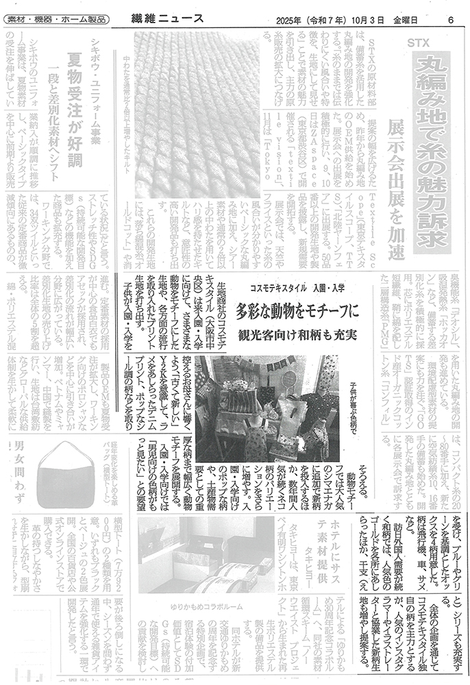 NEWS ALL FOR HOME HOBBY FOR FASHION FOR HOME HOBBY 2025.10.03 展示会の様子が繊維ニュースに掲載されました 展示会の様子が繊維ニュースに掲載されました Previous List