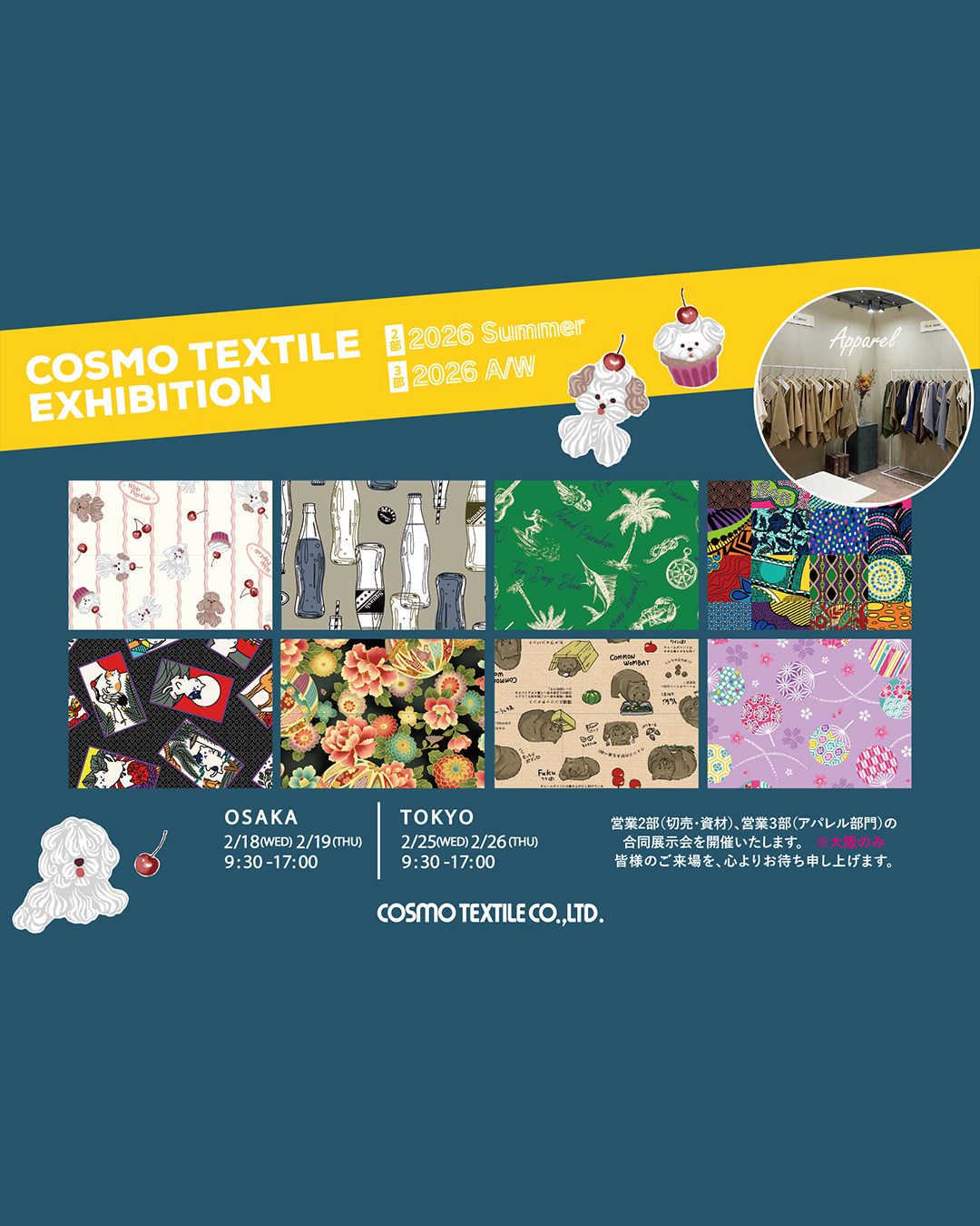 NEWS ALL FOR HOME HOBBY FOR FASHION FOR HOME HOBBY 2026.01.19 【展示会】2026年2月展のお知らせ コスモテキスタイル株式会社の2026年夏展示会を開催いたします✨今回は営業2部(切売・資材)大阪のみ3部(アパレル・2026年秋冬)の合同展示会となります。※一般のお客様はご来場いただけません。ご了承ください。 ■大阪 2/18(水)、2/19(木)9時30~17時 ■東京 2/25(木)、2/26(木)9時30~17時皆様のご来場を心よりお待ちいたしております。✨ Previous List Next