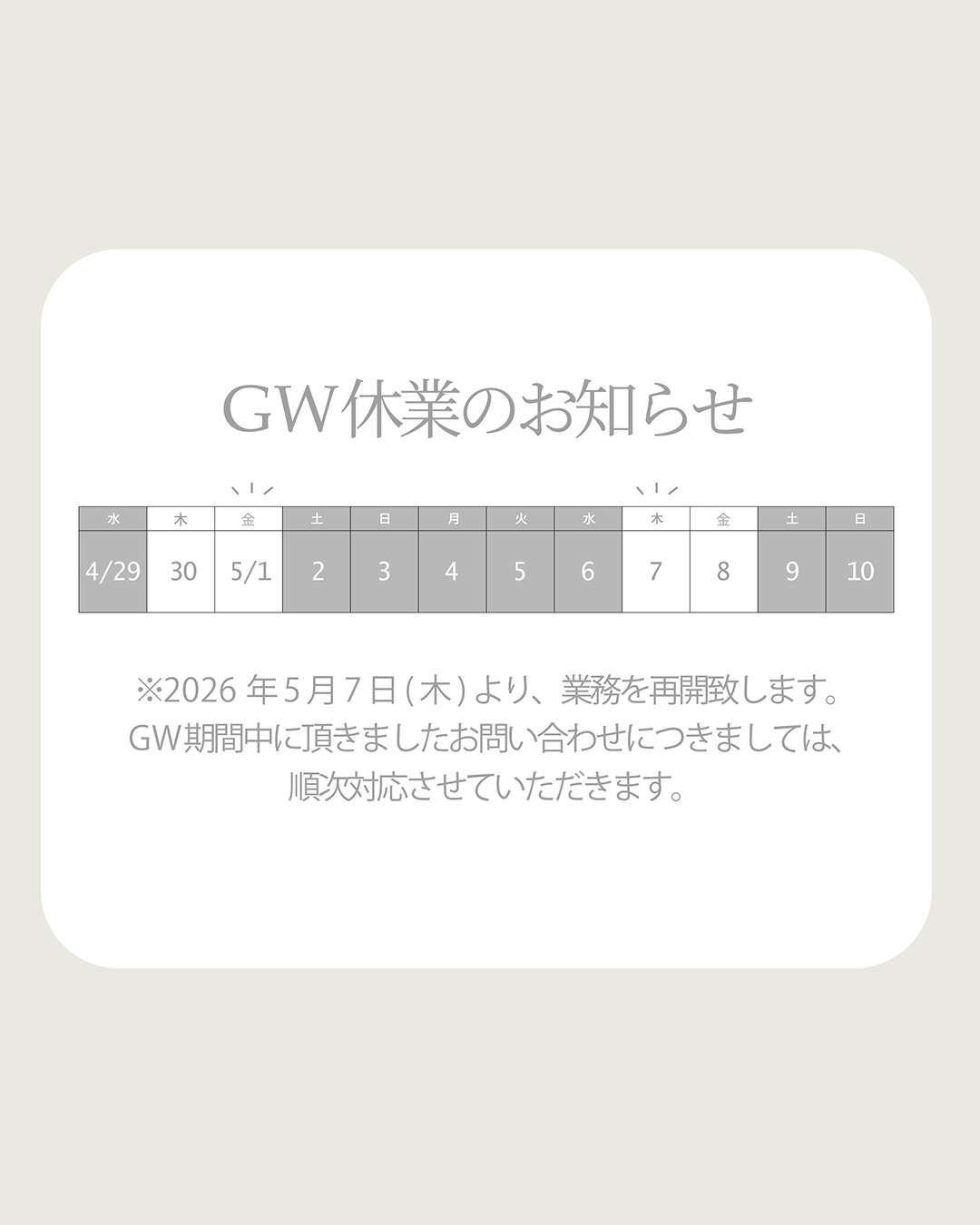 NEWS ALL FOR HOME HOBBY FOR FASHION ALL 2026.04.27 【GW休業のおしらせ】 【GW休業のおしらせ】 2026年5月7日(木)より、業務を再開致します。GW期間中に頂きましたお問い合わせにつきましては、順次対応させていただきます。期間中ご迷惑をおかけいたしますがご理解ご了承くださいますようお願い致します。 Previous List